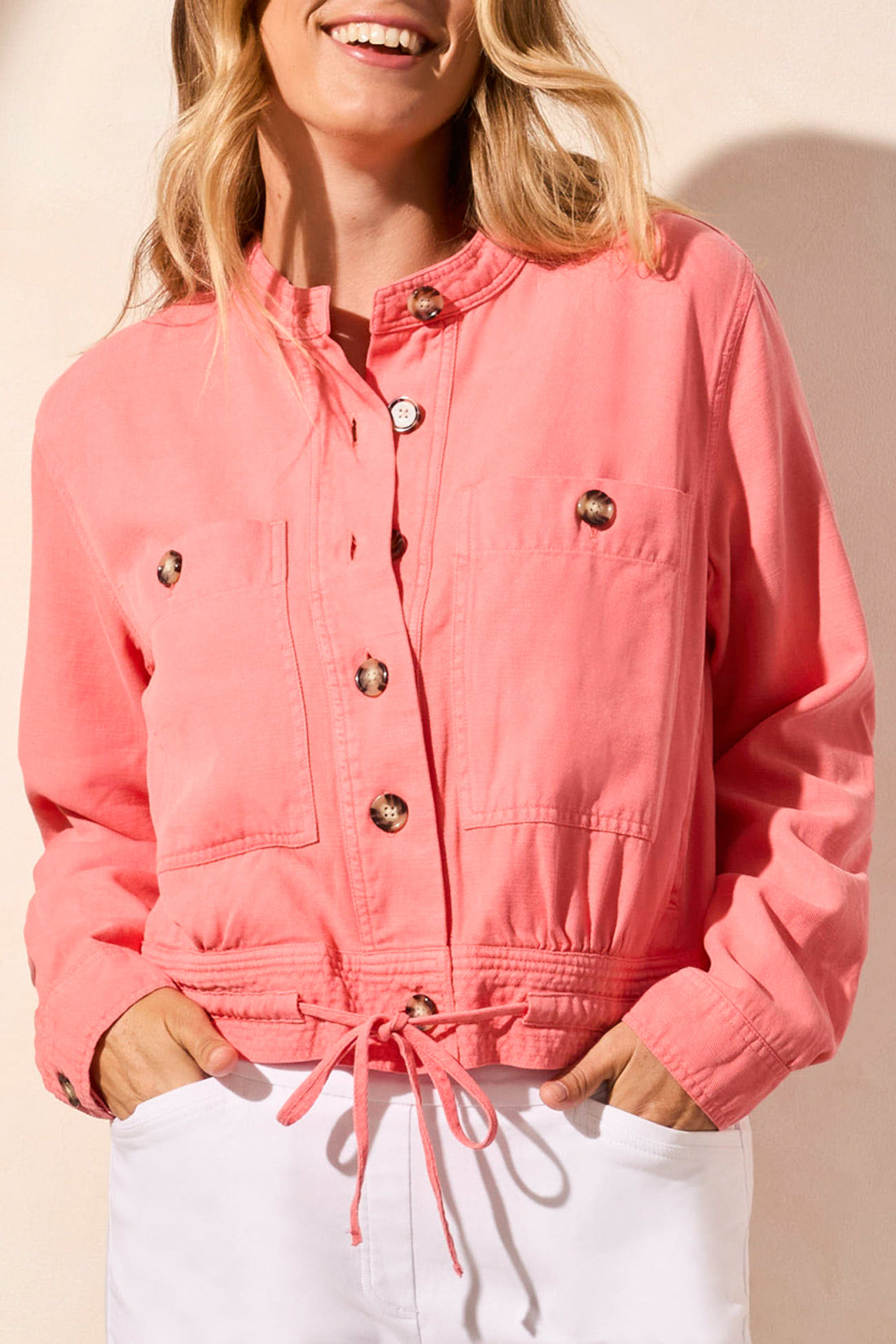 Cropped corded cotton jacket with faux wooden button and cinch tie.