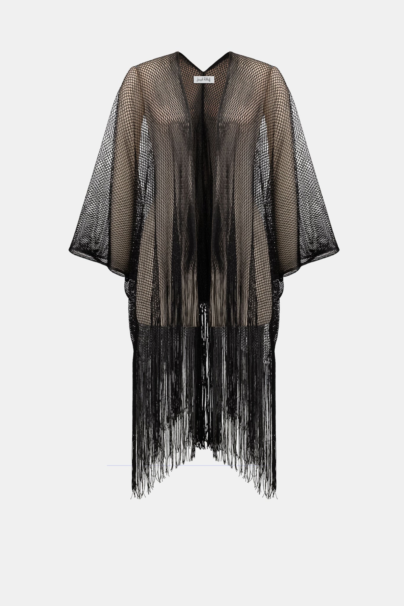 This woven open-stitch cover-up brings a lightweight layer with subtle texture and movement. Designed with a draped silhouette, it finishes with self fringe at the hem and a JR metal coin accent.